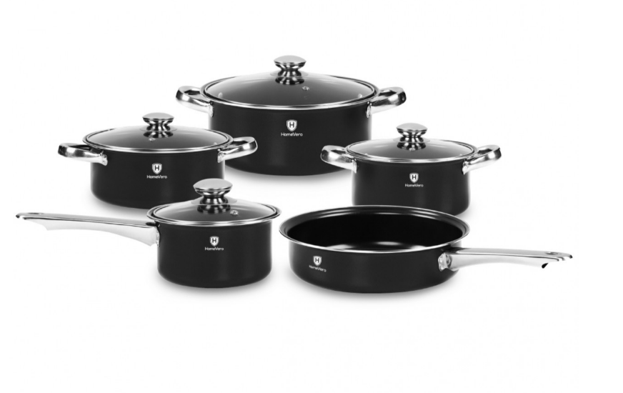 HomeVero Σετ αντικολλητικά μαγειρικά σκεύη 9 τμχ από ανθρακοχάλυβα σε μαύρο χρώμα HV-1009B
