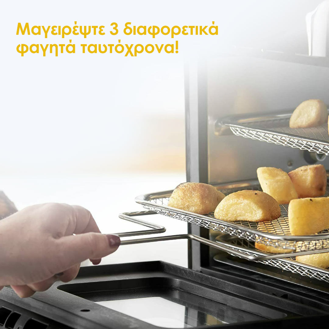 - Three racks (26 × 23.5 cm) for food dehydration, crispy snacks, and pizza