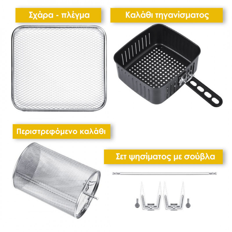 - Rotating basket, ideal for French fries, nuts, and other crispy snacks
