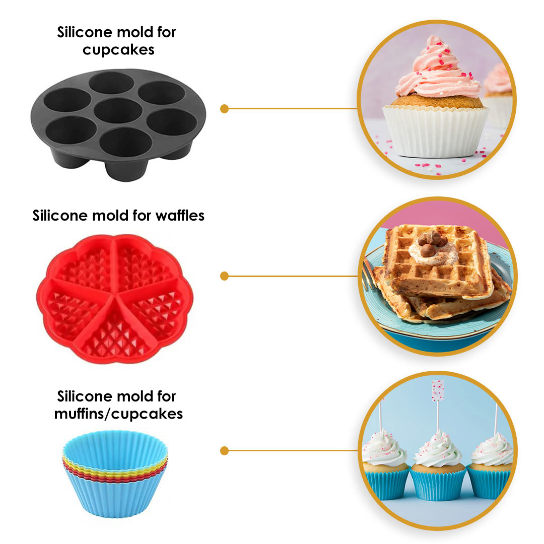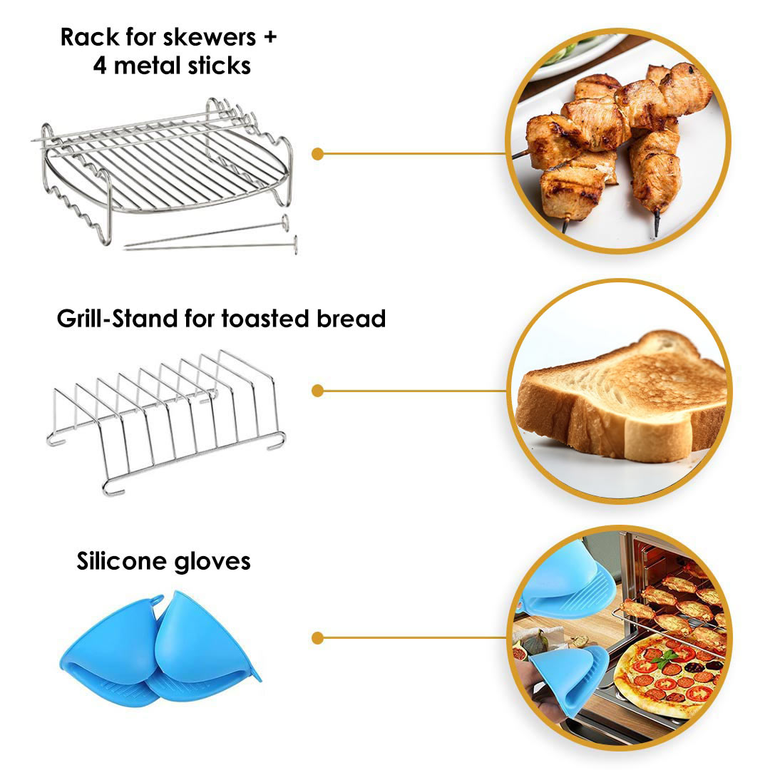 Το σετ αξεσουάρ HomeVero HV-AF20SET περιλαμβάνει σχάρες για ψωμί, μεταλλικά στικς για σουβλάκια, φόρμες σιλικόνης, φορμάκια για κέικ και άλλα. Είναι ιδανικό για να αναβαθμίσετε τη μικρότερη φριτέζα αέρος σας και να εξελίξετε τις μαγειρικές σας δημιουργίες. Με αυτό το σετ, θα έχετε όλα τα απαραίτητα αξεσουάρ νοικοκυρεμένα και εύκολα προσβάσιμα.