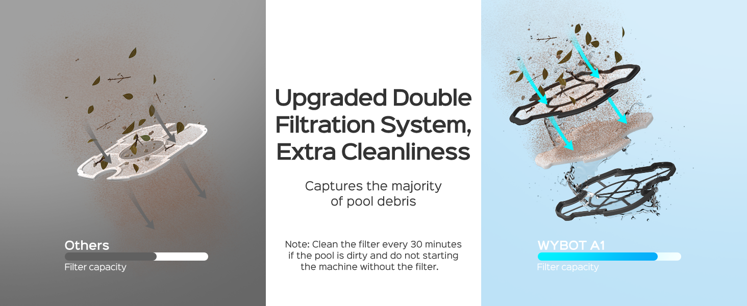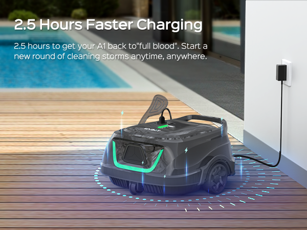 Το WYBOT A1 είναι η νέα γενιά ασύρματων ρομποτικών καθαριστών πισίνας, σχεδιασμένο για επαγγελματική απόδοση και ευκολία στη χρήση. Με 4 επιλέξιμους κύκλους καθαρισμού, 120 λεπτά αυτονομίας, διπλά φίλτρα και έξυπνη λειτουργία καθαρισμού ακμών, προσφέρει ολοκληρωμένη φροντίδα για την πισίνα σας.
